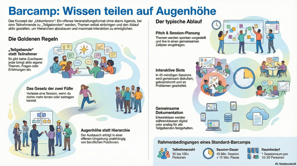 Ein Barcamp ist eine offene, partizipative Tagung mit Workshops, bei der alle Teilnehmenden aktiv in die Gestaltung und Durchführung der Sessions eingebunden sind. Es handelt sich um eine unkonventionelle, strukturierte Form des Austauschs und der Wissensvermittlung. Barcamps werden häufig genutzt, um den Dialog, die Vernetzung und den Wissensaustausch in einer hierarchiefreien Umgebung zu fördern.