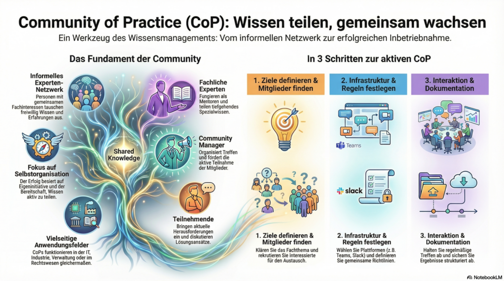 • Technische Infrastruktur: Für virtuelle CoPs sind Plattformen zur Kommunikation (z.B. Slack, MS Teams, Zoom) und Dokumentation (z.B. Confluence, Google Docs) erforderlich.