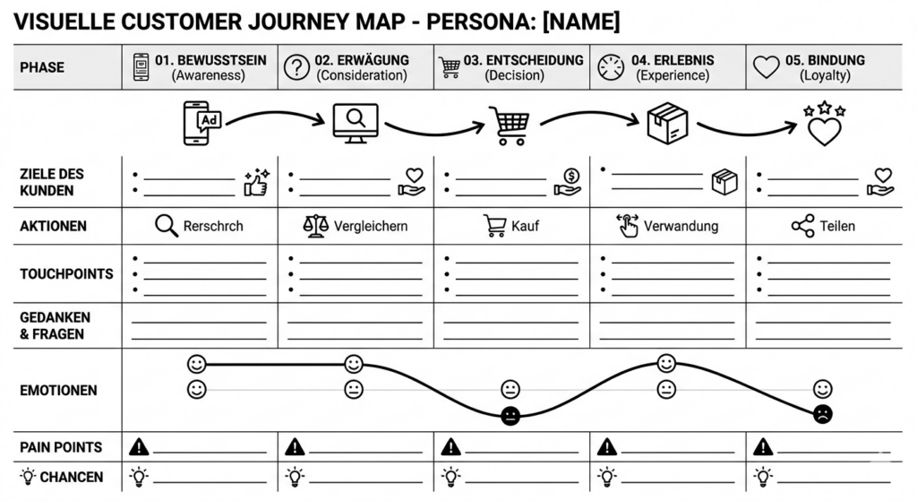 Eine Customer Journey Map ist ein visuelles Werkzeug zur Darstellung der Erfahrungen, Emotionen und Interaktionen eines Kunden über verschiedene Berührungspunkte mit einem Unternehmen oder Produkt. Sie hilft, das Verständnis für den Kunden zu vertiefen und Optimierungspotenziale aufzudecken.