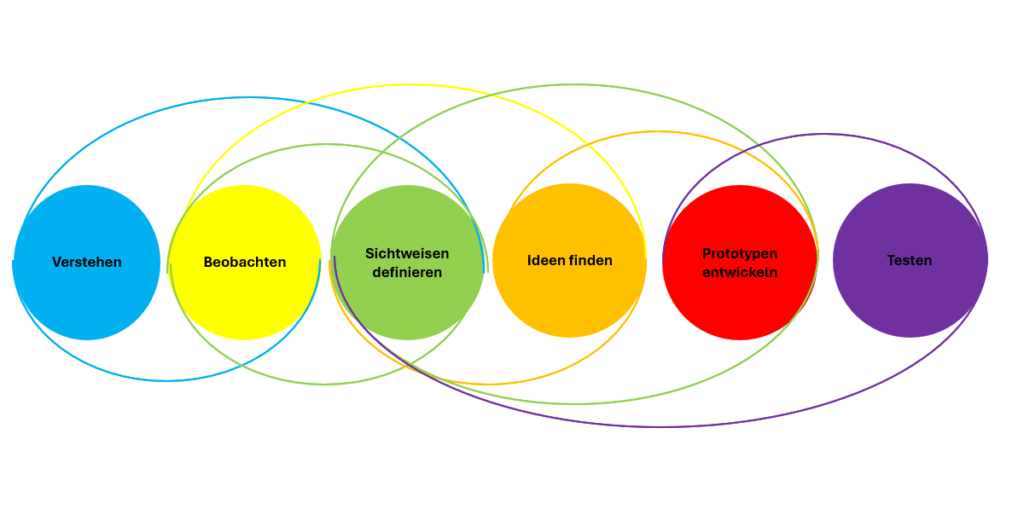 Typischer Kern ist ein iterativer Prozess mit fünf bis sechs Phasen: Verstehen → Beobachten → STandpunkte definiere Ideen entwickeln → Prototypen bauen → Testen. Diese Phasen werden iterativ wiederholt.