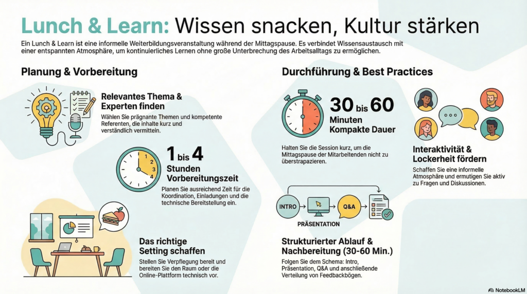 - Regelmäßige Veranstaltungen: Plane Lunch & Learn-Veranstaltungen regelmäßig ein, um kontinuierliches Lernen und den Wissensaustausch zu fördern.