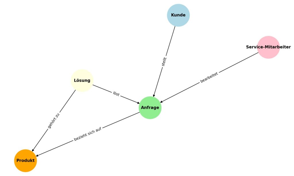 • Beziehungen: „Kunde stellt Anfrage“, „Service-Mitarbeiter löst Anfrage“, „Lösung bezieht sich auf Produkt“