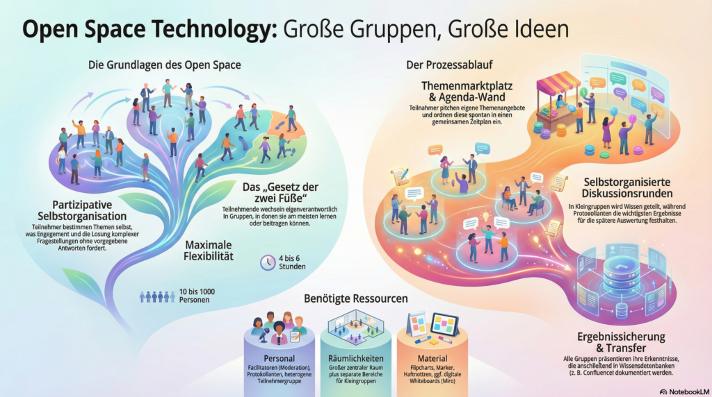 Hier findest du eine KI‑generierte Audio‑Zusammenfassung der Open Space Technology. Sie fasst die wichtigsten Inhalte der Methode kompakt zusammen und eignet sich besonders zum nebenbei Hören.