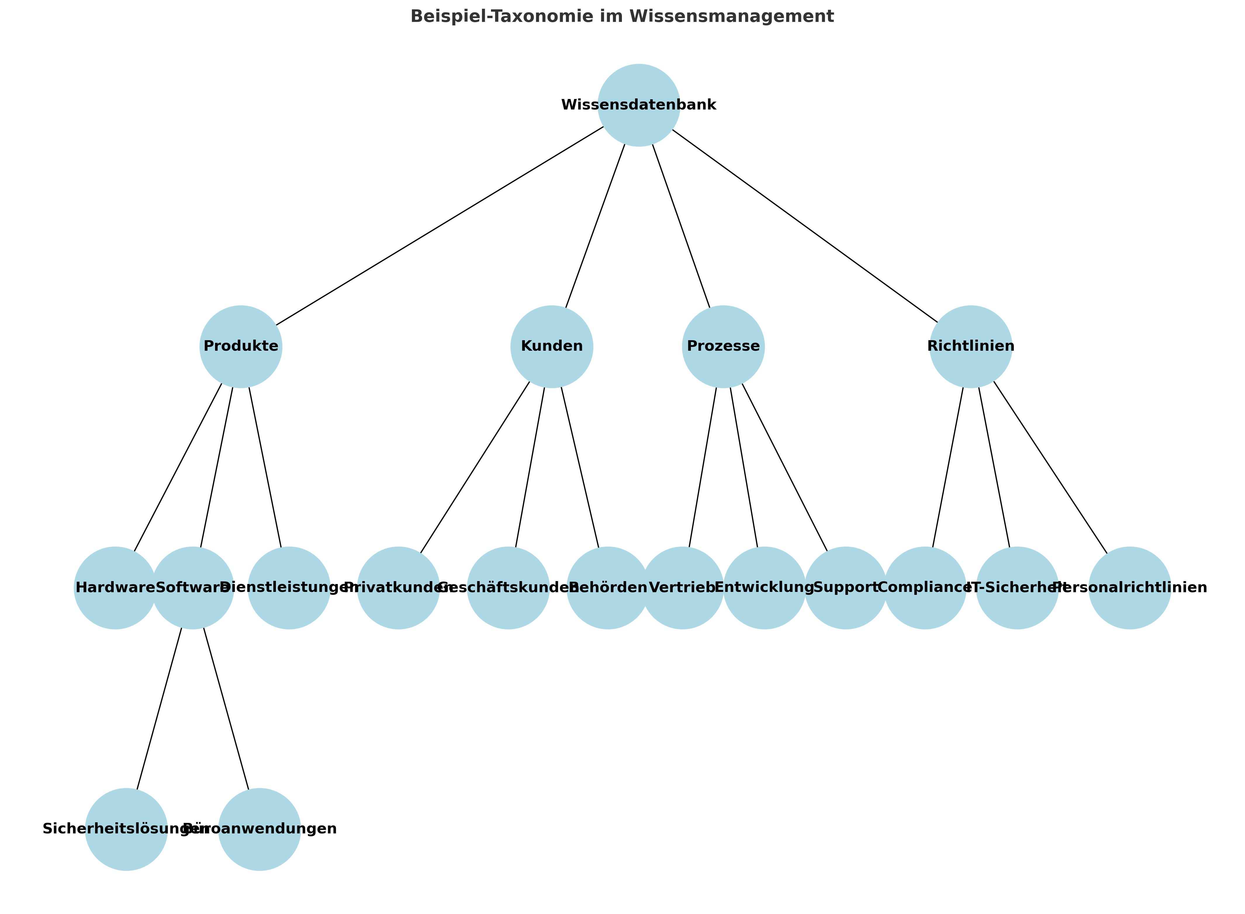 Eine Taxonomie ist ein Ordnungssystem, das Wissen in hierarchischen Kategorien organisiert. Sie erleichtert den Zugang zu Informationen und sorgt für ein gemeinsames Verständnis von Begriffen im Unternehmen. Taxonomien werden besonders dort eingesetzt, wo große Mengen an Daten, Dokumenten oder Wissen strukturiert verwaltet werden müssen.