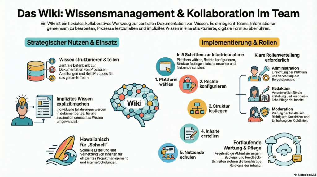 Ein Wiki ist ein kollaboratives Werkzeug, das es ermöglicht, Wissen zentral und strukturiert zu dokumentieren, zu teilen und gemeinsam zu bearbeiten. Es eignet sich besonders für Organisationen, um Informationen zugänglich zu machen und die Zusammenarbeit zu fördern. Ein Wiki ist flexibel, einfach zu bedienen und kann von mehreren Personen gleichzeitig genutzt werden. Es ist wichtig, dass alle Benutzer die Richtlinien für die Nutzung des Wikis befolgen, um die Qualität und Konsistenz der Inhalte zu gewährleisten.